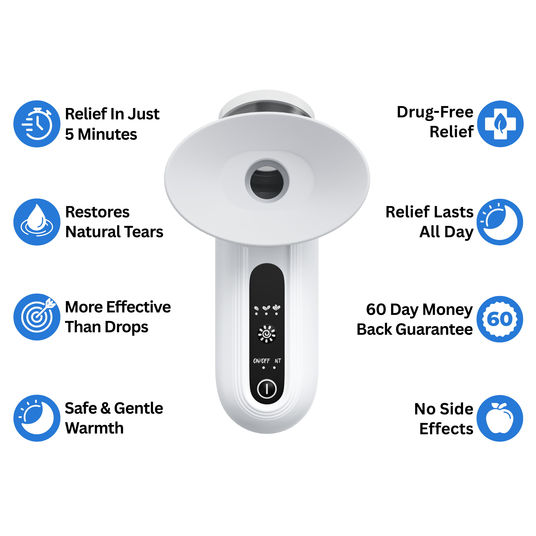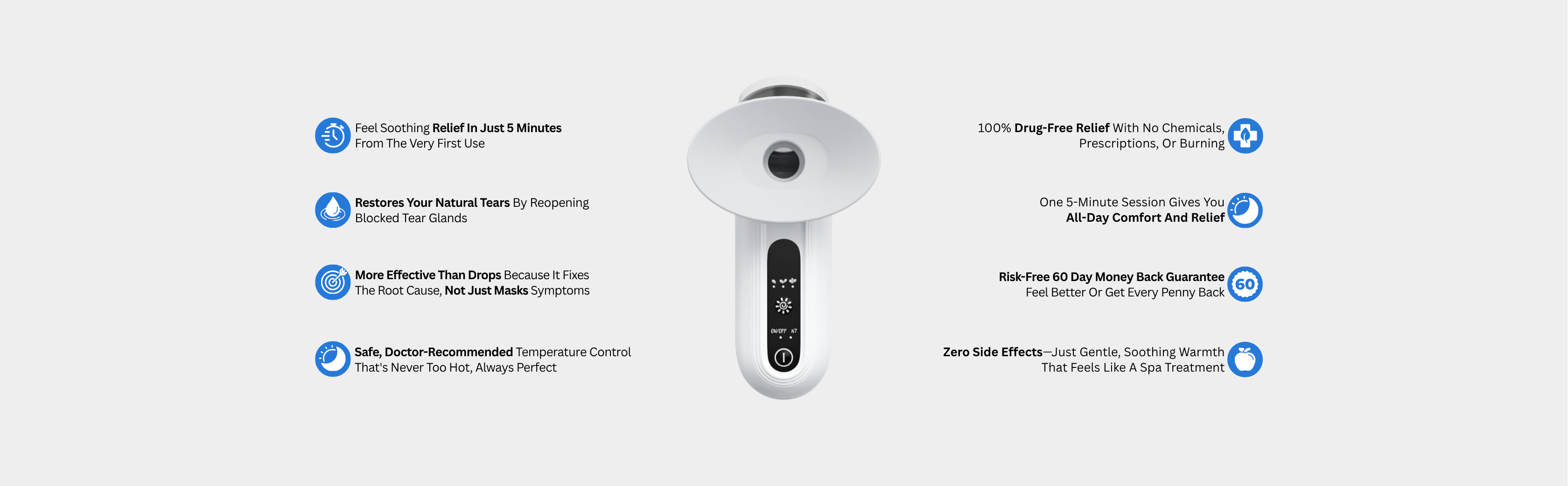 Every feature was specifically engineered to target the root cause of dry eyes: blocked tear glands. Not just mask symptoms like drops do, but actually heal and provide long-lasting relief.